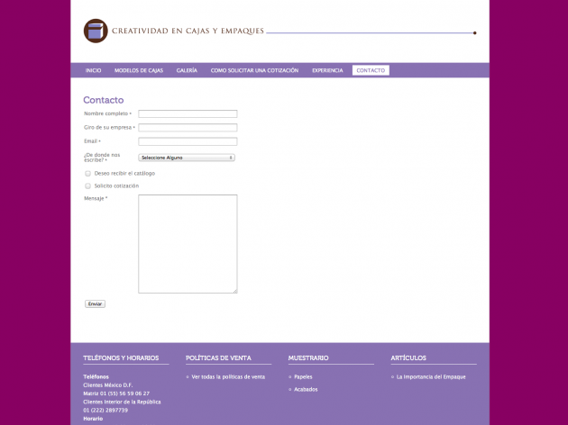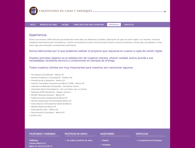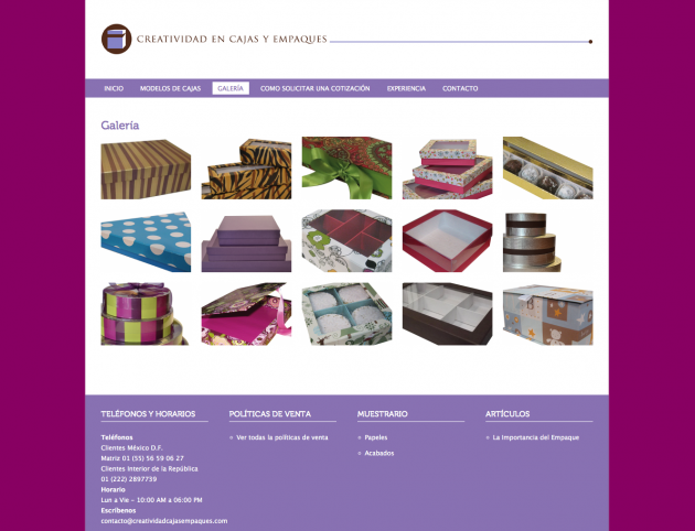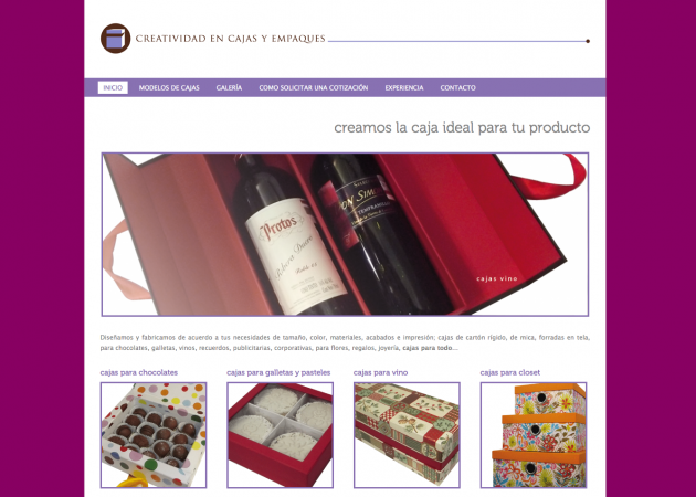 Este es un trabajo de rediseño y creación de un nuevo sitio web informativo con galería de productos para Creatividad en Cajas y Empaques, negocio ubicado en la ciudad de México Distrito Federal, México.